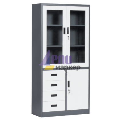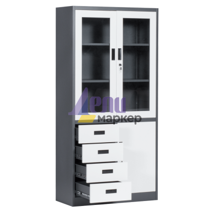 Carmen CR-1278 E SAND е практичен метален шкаф за документи със заключване и удобно разпределение, включващо: 1 голям шкаф със стъклени врати и 2 рафта, един по-малък шкаф с 1 рафт и 4 чекмеджета. Размери: ш. 90 см / д. 45 см / в. 185 см. Пълна информация за размерите и характеристиките на модела ще намерите в таблицата в таб/поле "Техническа информация".